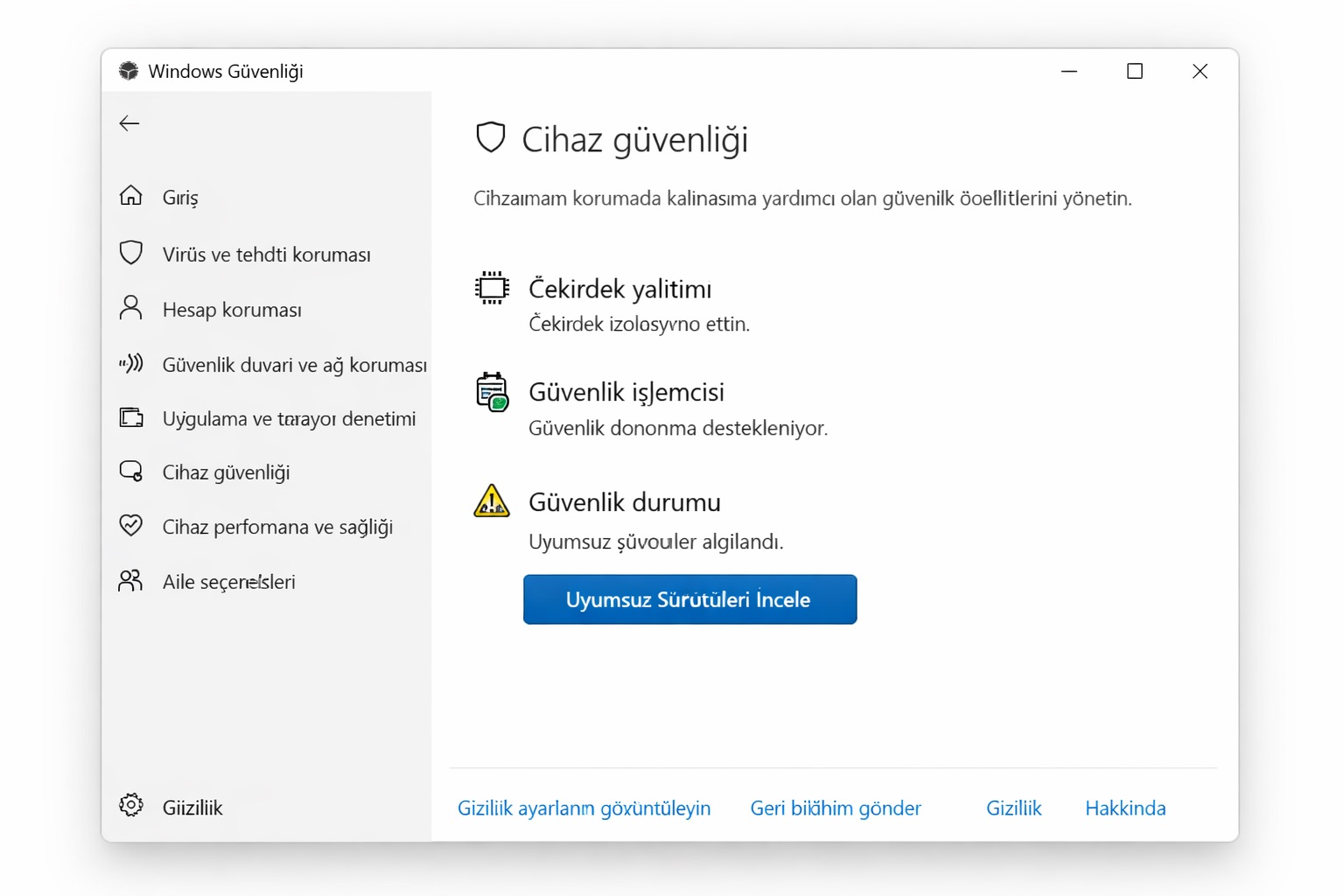 - Windows Güvenliği > Cihaz Güvenliği > Çekirdek Yalıtım Ayrıntıları yolunu izleyin.
