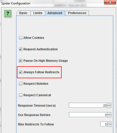 Sitenizi taramadan önce, yapılandırma ayarlarının “Gelişmiş” sekmesine gidin ve “Her Zaman Yönlendirmeleri İzle” seçeneğinin işaretlendiğinden emin olun.